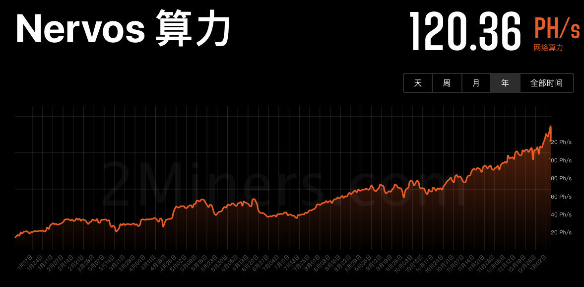 2021 年初,Nervos CKB 的全网算力不到 16PH/s,而现在已经超过了 120PH/s,增长了 6.5 倍。