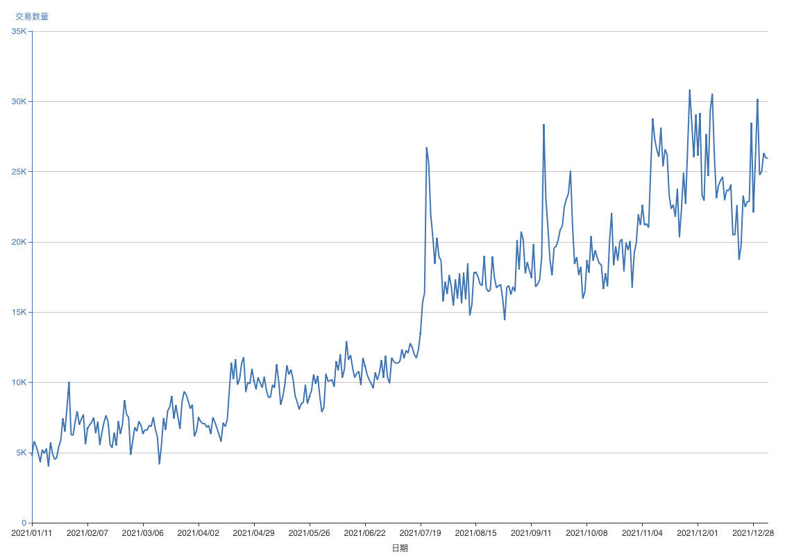 2021 年初,CKB 链上交易数基本稳定在每天 5000 笔左右,到年末的时候,这个数据达到了 27500 笔左右,增长了 4.5 倍。