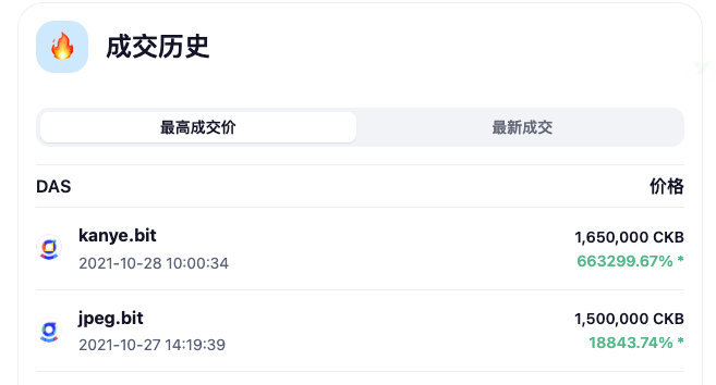 另外,DAS 还上线了二级市场 BestDAS。目前成交价最高的 DAS 账号是 kanye.bit,为 165 万 CKB;其次是 jpeg.bit,成交价 150 万 CKB。