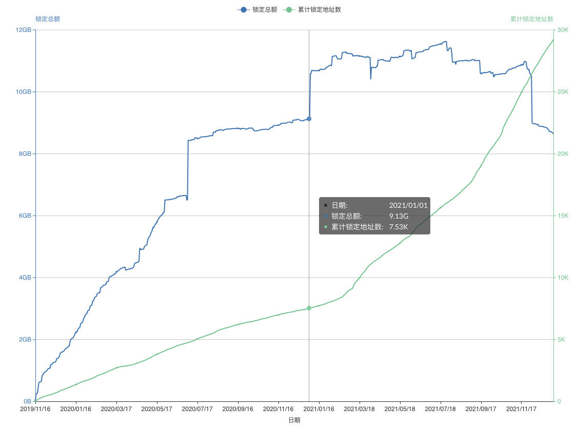 2021 年初,Nervos DAO 上锁定的 CKB 数量为 91.3 亿,累计共有 7530 个地址参与。今年最高时,锁定在 Nervos DAO 中的 CKB 数量有 116.3 亿,后面因为 Nervos 上的 Layer 2 DEX 产品 YokaiSwap 开启了流动性挖矿,很多人将 CKB 解锁出来拿去挖矿了。到年末时,Nervos DAO 上锁定的 CKB 数量为 87.1 亿,累计的参与地址数为 28890。