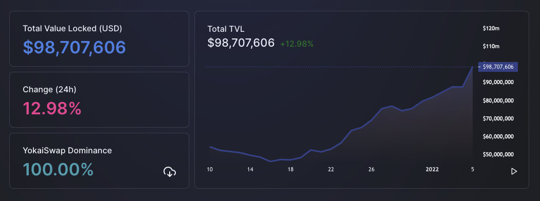 截至写文,YokaiSwap 上的总锁仓价值(TVL)已经超过 1 亿美元。