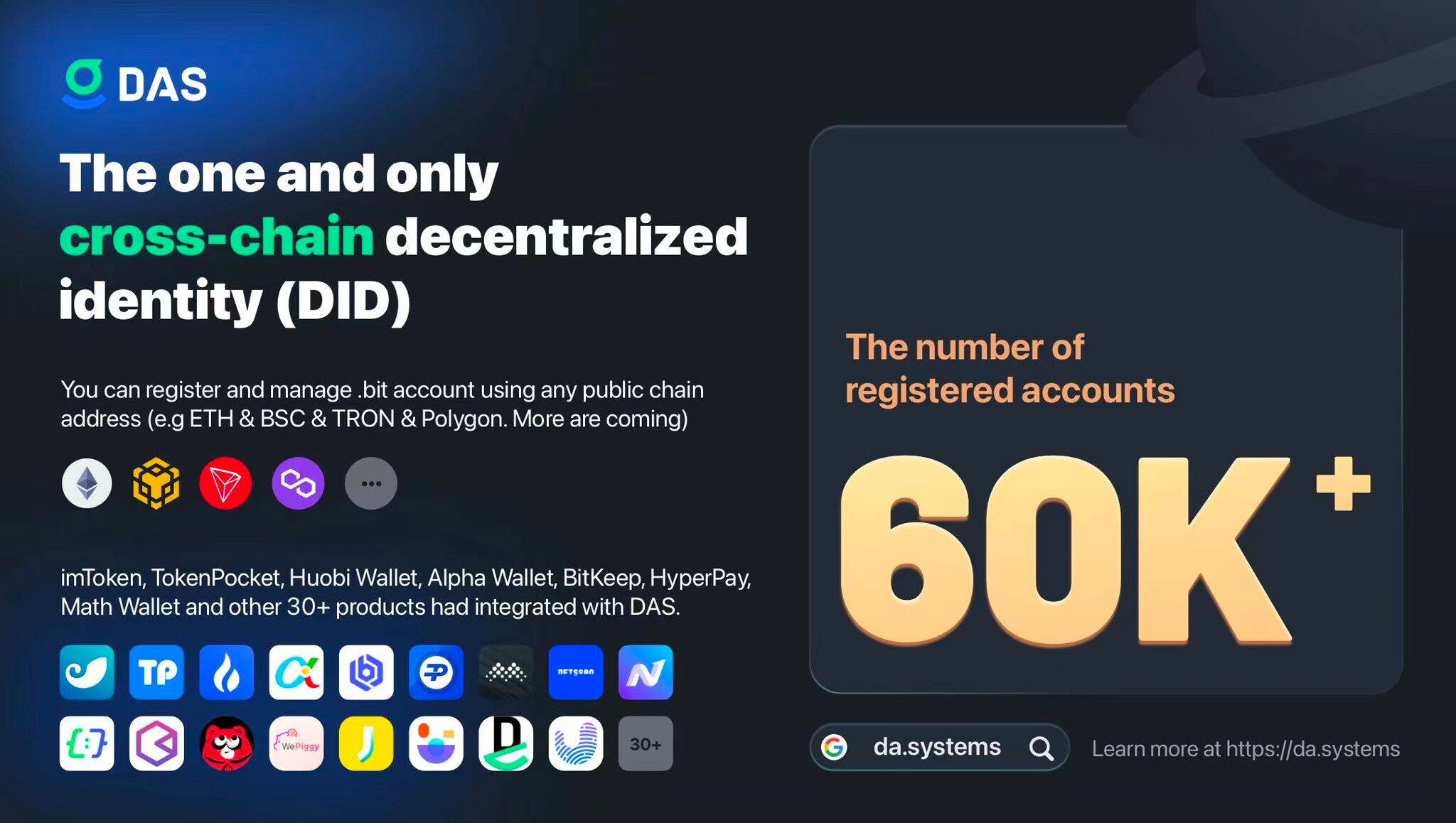 「.bit」由原 DAS 品牌升级而来,从纯域名协议演进为跨链去中心化身份系统。作为 ENS 之外又一基于域名的去中心化身份系统,「.bit」在用户数和生态活跃度方面一直处于赛道前列,致力于成为 Web3 时代用户数字身份的关键载体。