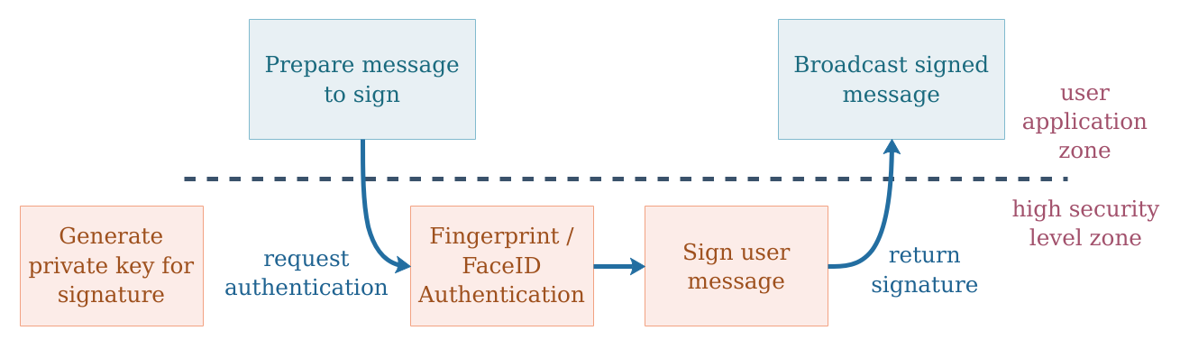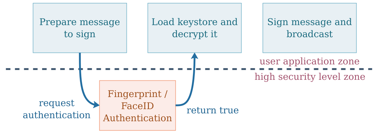 上图是标准的软件钱包加生物识别授权的程序流程图。可以看到,密钥的保存和加解密都是在应用层实现的,攻击者很容易截取私钥数据,或者绕开生物识别认证。