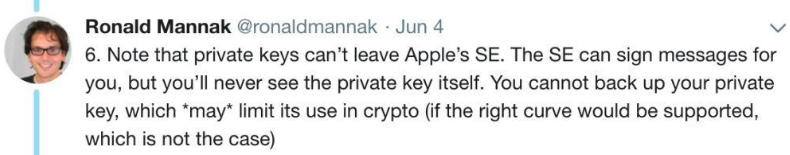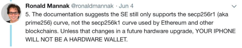 这么好的模式为什么数字货币钱包没有采用呢?因为不论是 iOS 还是 Android,其硬件安全的签名算法只支持有限的几种,并不支持 BTC、以太坊采用的 Secp256k1 算法。前段时间 Apple 宣布推出 CryptoKit 密码学 API 扩展,就有区块链开发者吐槽难以用在数字货币钱包里面。