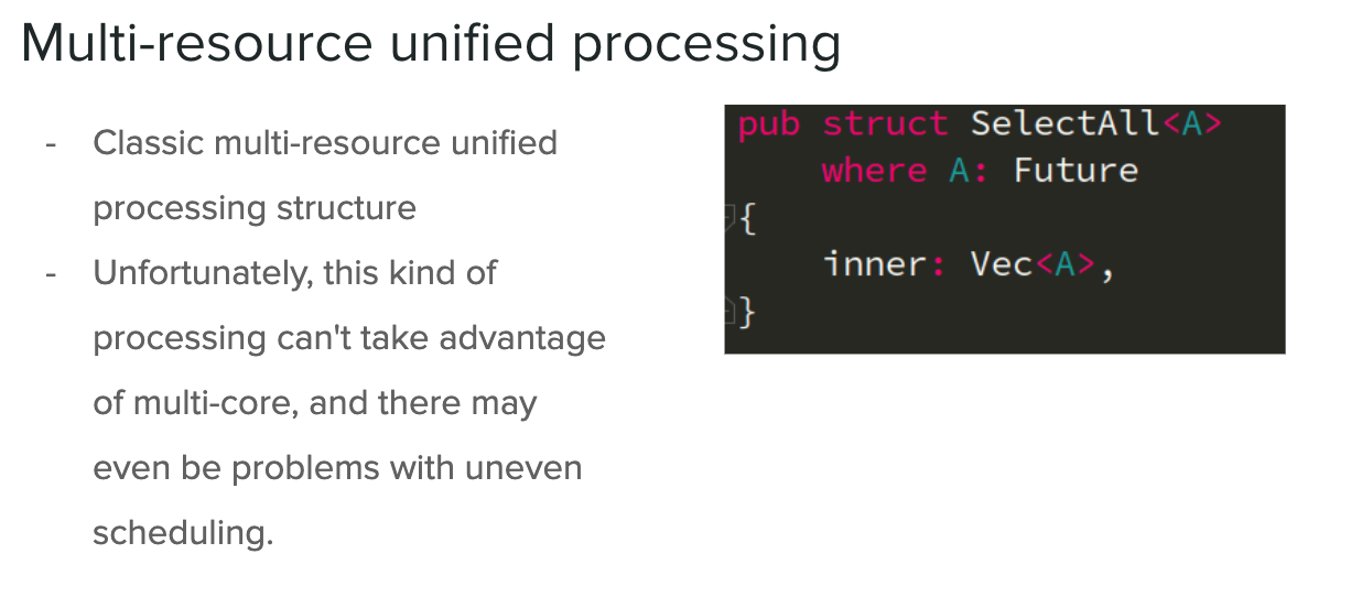 第三种模式是不管 future 、task 是什么,全部转成一个 trait object 放在一个地方。这种方式是有应用场景的,但是如果作为一个 Service 的 stream(流式数据)去做,会出现调度不均和响应不及时的问题,而且多核的利用率是极低的。这种方式对于一次性的多个任务是可以推荐的,但是如果是一个常驻的流式数据,尽量就不要用这种方式。
