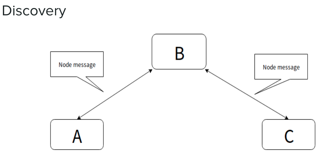 例如 A 和 B 连接之后交换一下,我们认为他们是已经存储的节点,接下来 C 连接上了 B ,B 和 C 交换,双方已经知道节点。之后会有第二次操作,B 定时查看当前已经连接的节点,然后将 C 的信息告诉 A ,再将 A 的信息告诉 C,这是一个相对来说比较简单的自发现过程。实际上我们对网络上任何消息都是持怀疑态度的,需要自己与上层的协议确认是否可靠,比如尝试去拨一下,看它是不是真的,再做其它处理。