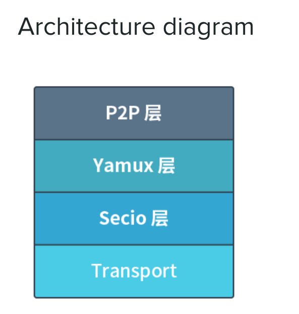 这是我们库目前的架构,自上而下分为四层 ,最下面一层是 Transport,它的作用是支持现有的协议,可能是 TCP 、KCP 或者一些现有的常见协议,实现在这些协议的基础上可以支持自定义的上层协议;往上一层是 Secio ,实际上它还是有一定的局限性的(后面会提及);再上一层是 Yamux,它是 libp2p 的一个子协议,它的作用是实现多路复用;最上层是 P2P ,它是对下面三层的整合,导出一个对用户相对来说比较友好的 API。这个四层架构和 HTTP(它的最下层是 TCP,往上一层是 TLS 加密,再上层是 HTTP 的一些自有协议)看起来是非常相似的。
