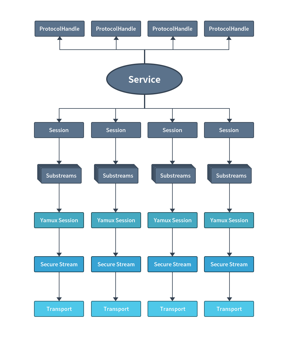 在这一层很重要的一点,就是开始说的我们需要抽象 Protocol 的概念。 Protocol 的概念实际上是绑定了 Substream,那么如何知道一个 Substream 就是一个 Protocol ,实际上还需要类似于加密握手的过程(Protocol Select 的过程)。客户端会发送想要的 Protocol 给 Service,Service 确认支持的情况下,就把 Protocol 的 Name 发回去,如果不支持就 Null 回去,这个 Substream 就断了。