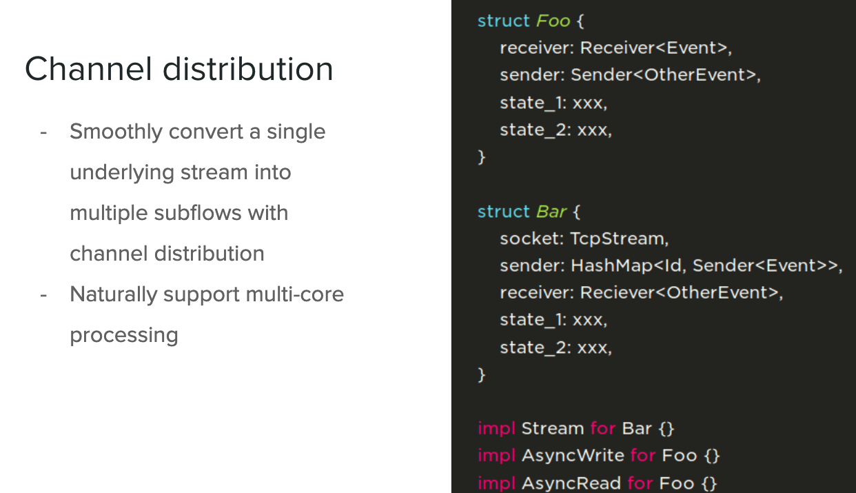 第二种模式就是在一个多路复用的协议里用 Channel 分发的模式实现。这种模式需要的底层资源除状态之外,还需要 sender 和 receiver, receiver 接收上层传过来的 event,sender 把底层的 message 通过 index 的方式丢给上层,这种方式相对于第一种方式的优势是每一个 future 都是单独的,天生的多核利用能力,十分契合 Tokio 的 work-steal runtime 模型。劣势是代码相对来说会比较复杂一点。