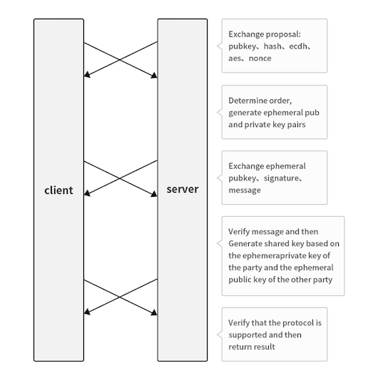 首先是交换公钥,一个随机数,一个 nonce,一堆提议之后,双方确认正常,生成一个临时的非对称加密的公钥和私钥,然后签名,把公钥发给对方,确认公钥是正常的情况下,通过对方的临时公钥和自己的临时私钥生成一个共享加密私钥,最后把一开始生成的 nonce 发给对方,确认握手是没有问题的。