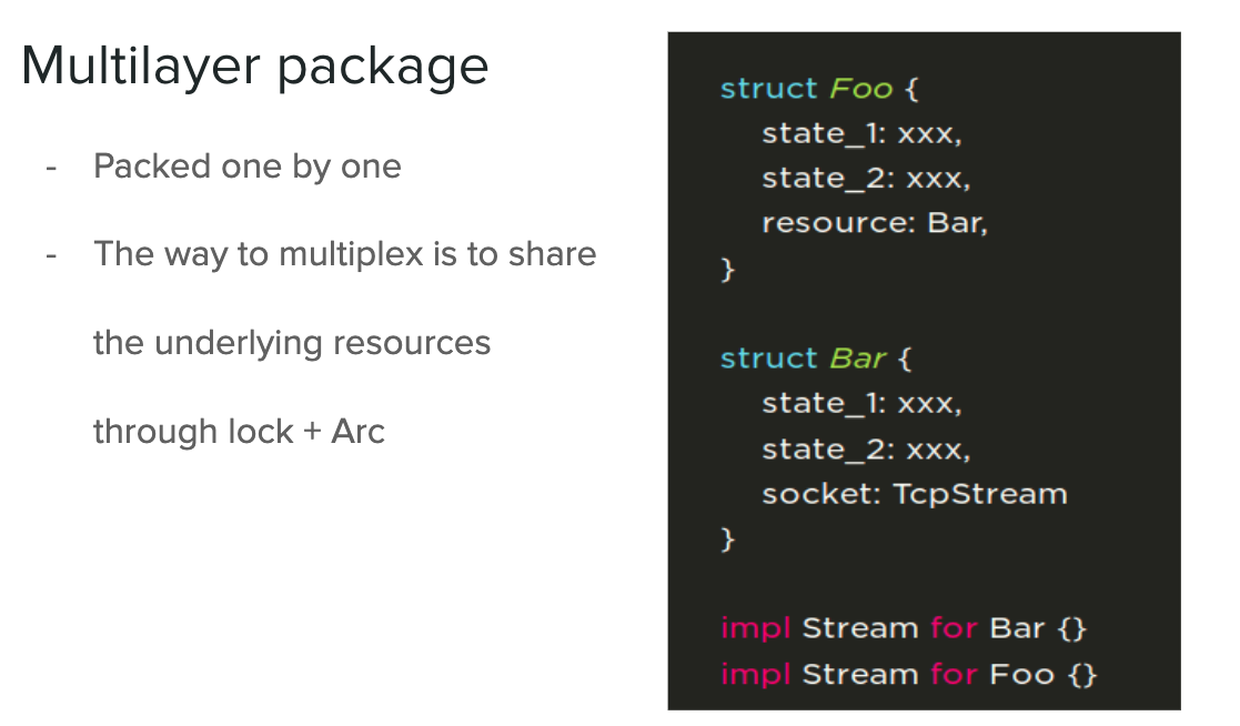 这种方式对于实现多路复用会有一个问题,最底层可能需要 Arc+lock,目前异步的生态基本都是运行在 Tokio 的 runtime 上,为了性能肯定是要多线程编程。而在多线程编程的情况下,使用锁的时候不要说异步,即便是同步也都会碰到一些奇奇怪怪的问题。所以就算这种方式能实现多路复用,还是选择了舍弃这种方式,因为锁的机制很有可能无法把控。