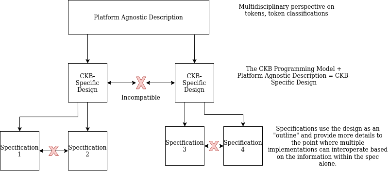 To enable interoperability requires an even further degree of specificity, where a minimum set of unambiguous details are put forth & agreed upon, such that all specification-compliant implementations are interoperable. This is illustrated in the diagram below.