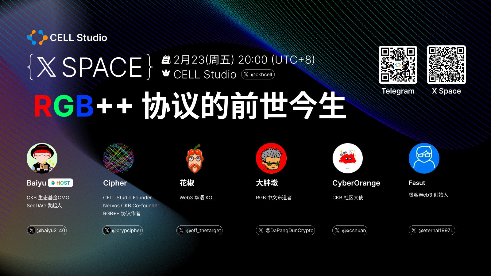 2 月 23 日,CELL Studio 创始人/Nervos CKB 联合创始人/RGB++ 协议作者 Cipher、Web3 华语 KOL 花椒、RGB 中文布道者大胖墩、极客 Web3 创始人 Fasut、CKB 生态基金 CMO/SeeDAO 发起人 Baiyu 以及 CKB 社区大使 CyberOrange,在 X Space 的直播活动中,和大家聊了 RGB++ 协议的前世今生。