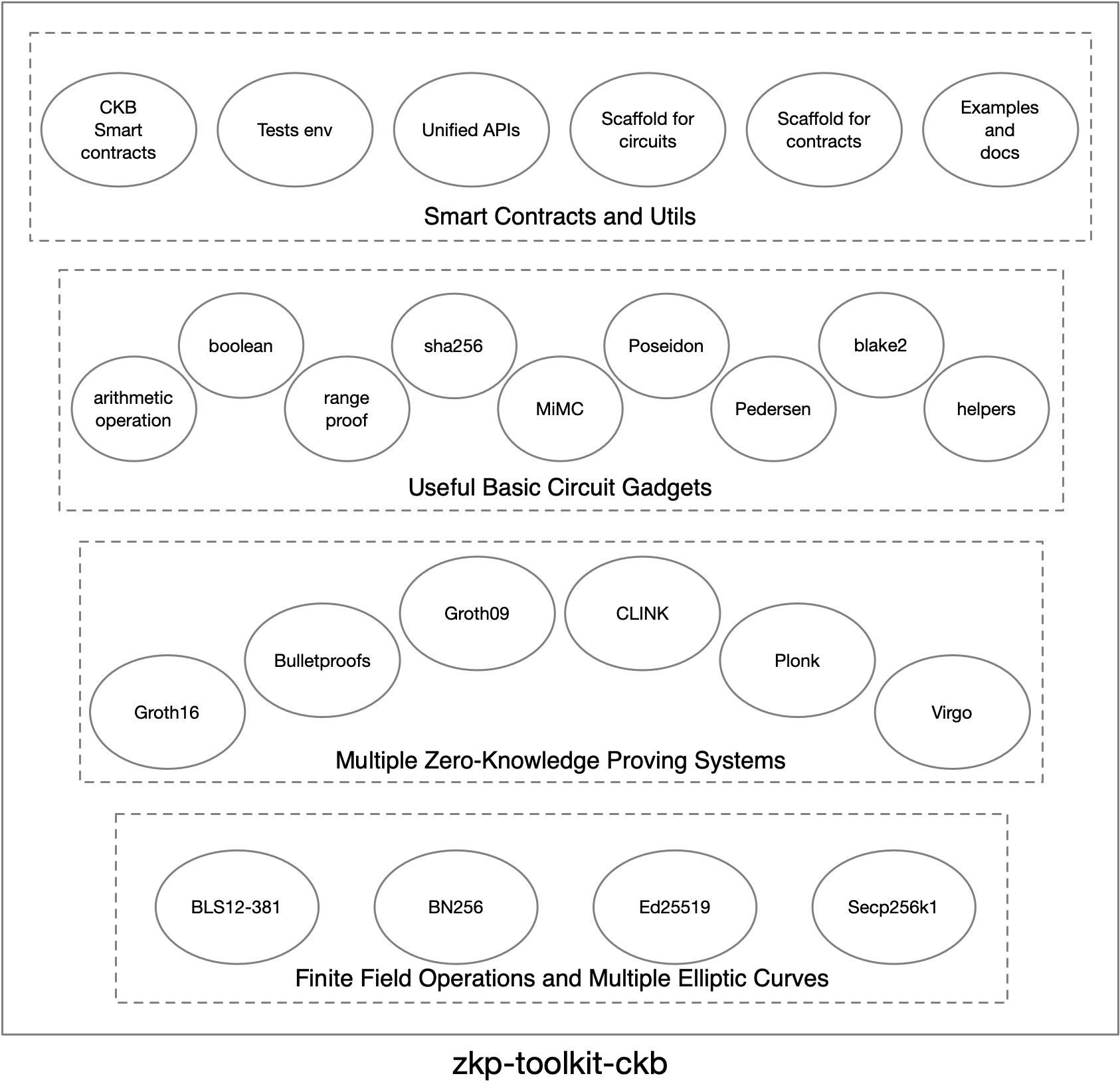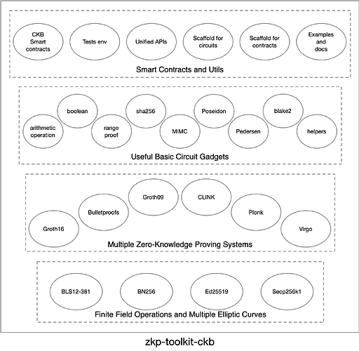 Lastly but most importantly, zkp-toolkit-ckb is built for the Nervos ecosystem. So this project will try to find out what’s the best fit for Nervos, what’s missing on it, what should be integrated into layer-1 during the whole research and development. We’ll explore the best practice for ZKP applications on Nervos blockchain. The on-chain CKB smart contract libraries to accompany with different ZKP schemes are also important parts in zkp-toolkit-ckb. We could also provide scaffolds for writing and testing ZKP circuits and smart contracts.