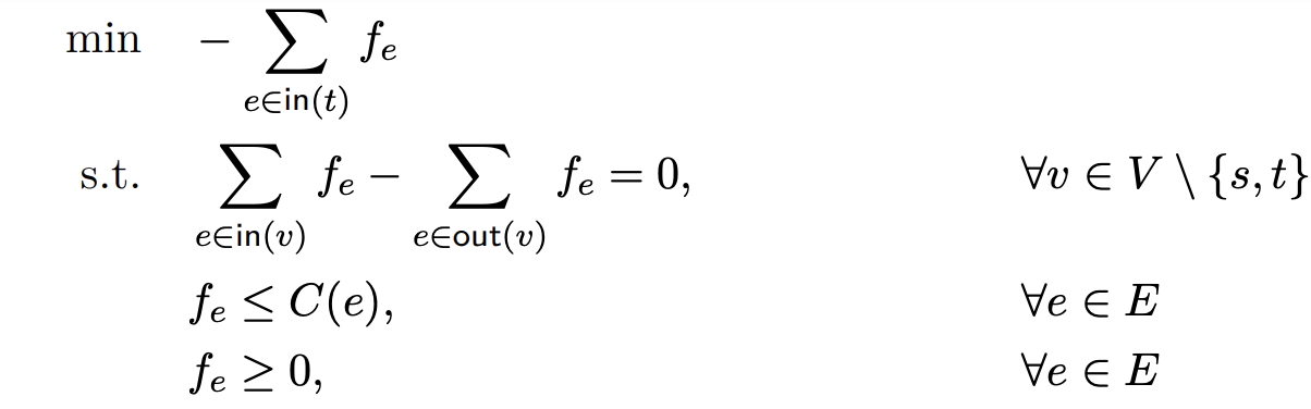 最大流是在网络流模型上的一族线性规划问题。其中从 s 到 t 的单源单汇最大流问题( \texttt{MAXFLOW}^{\textrm{SSSS}}_{V,E,C,(s,t)} )是: