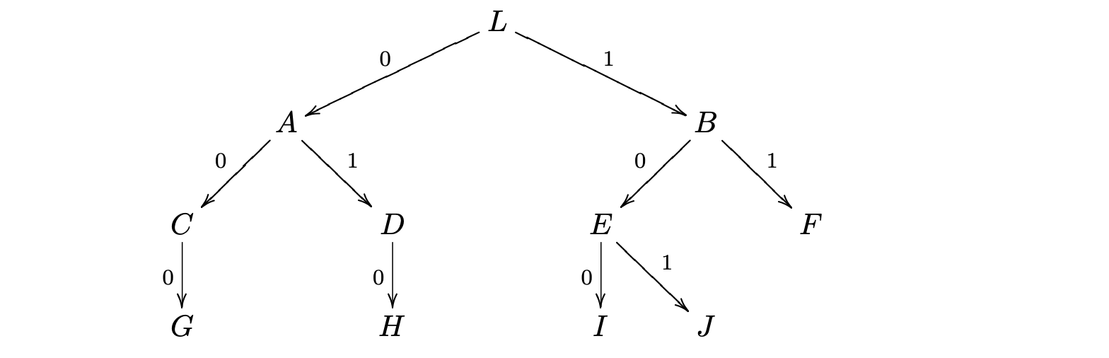 这样,可以用一种类似Trie树的方式,为每个节点用从根节点到该节点的路径编号。例如下图中, D 节点的标号即为 (0,1) , H 节点的标号即为 (0,1,0) , J 节点的标号即为 (1,0,1) 。当然,我们只是在用二叉树举例,现实实现中这是一颗多叉树,此时的编码范围就不再是 0 与 1 之间。对于 k 叉树而言,编码范围就成了 0 至 k-1 。