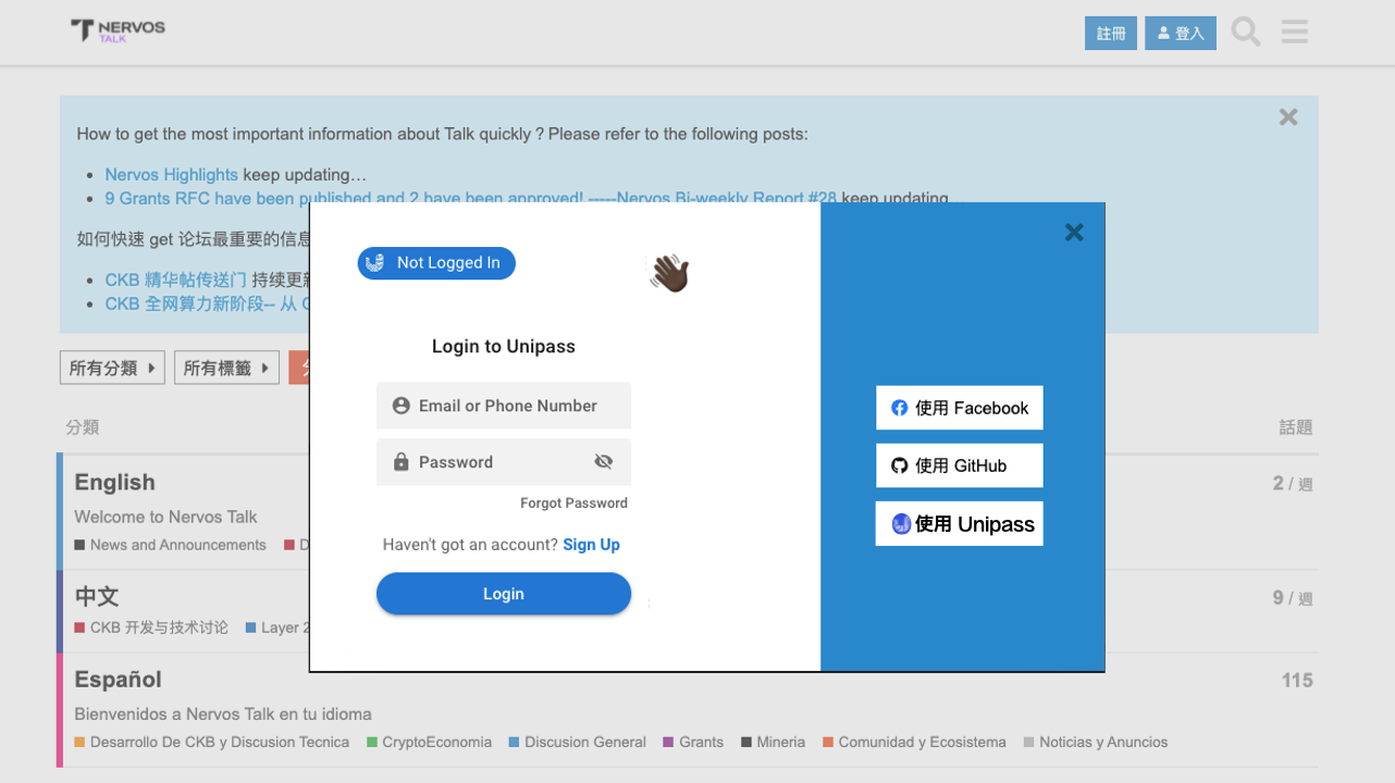 紧接着你会问,怎么样能够在这个钱包中创建一个 Nervos 的钱包账户呢?你只需要创建一组属于自己的账号密码,并且通过邮箱的验证码就能够生成一个区块链钱包。 同时,他还能够放置在任意 dApp 的登入页面中,以弹窗的方式呈现出登入的入口,如此一来,钱包就不是你需要去下载的插件或者手机 App,而是你要用时,任何开发商就可以为你准备好的进入入口。