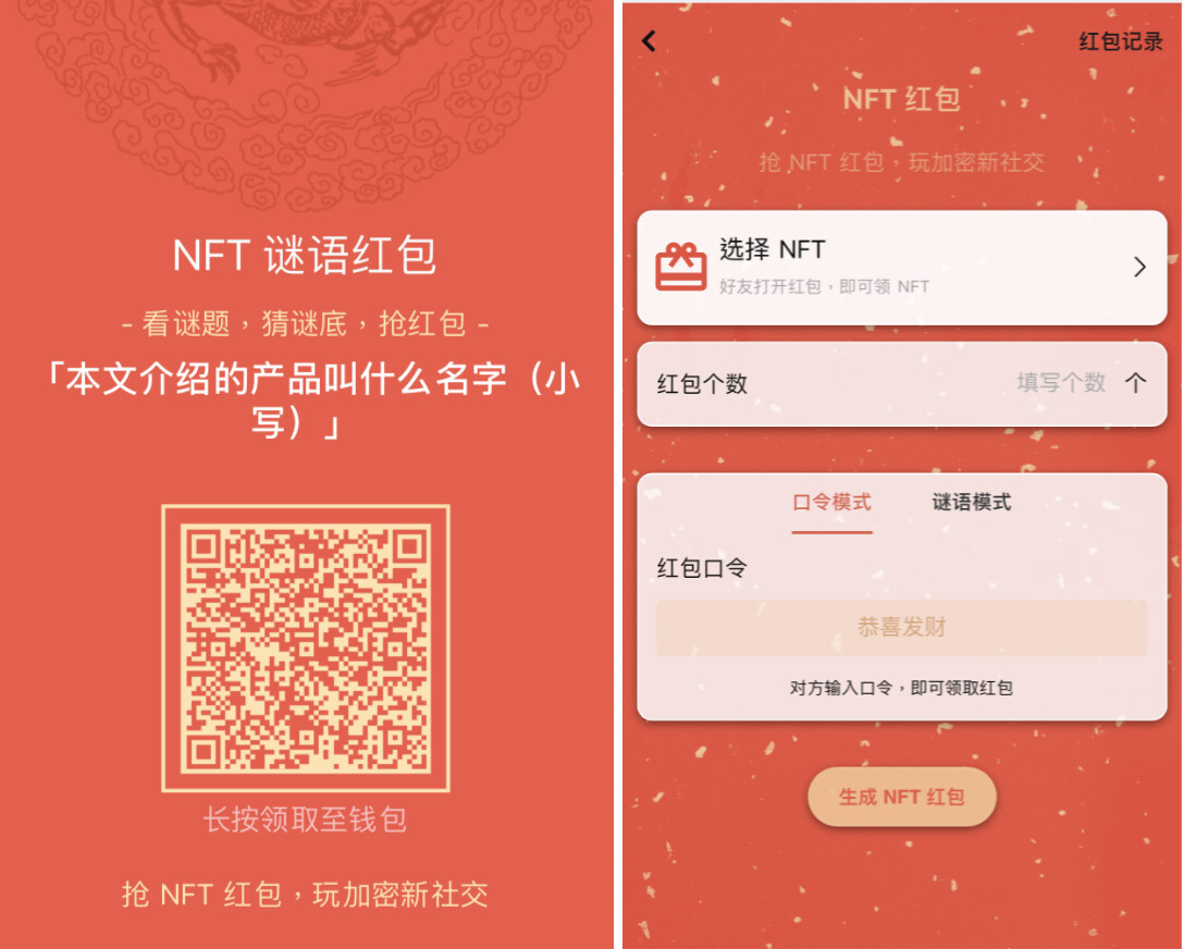 Unipass 还有一个红包的功能,可以让任何人拿走你的加密货币资产,还可以用口令以及谜语红包,红包中的资产目前有 NFT ,甚至未来还能 Fungible Token 。
