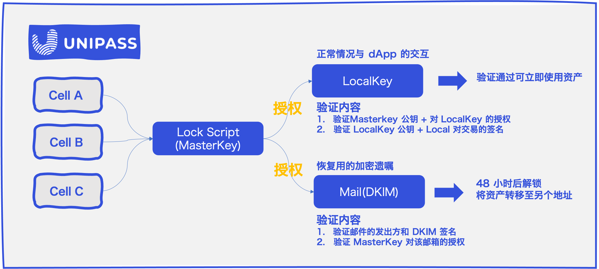 通过 MasterKey 对于邮箱的 DKIM 签章授权,我们可以让 CKB 链上去验证「DKIM的发出单位、是不是指定的邮箱所发出,以及是否带有授权签名」,进儿让我们可以转移自己账户的资产,这就是让我们可以在忘记 Unipass 的密码,也就是丢了我们的 Key 的时候还可以恢复这个资产的办法,因为当你忘记密码的时候,这世界上是没有其他人能够帮你保存 Unipass 非托管钱包的公私钥信息的,我们能够依靠的惟一办法,就是你起初的注册邮箱的签名,因为 Unipass 已经事先授权了这个邮箱的签名可以解锁该 Cell 的 lock。